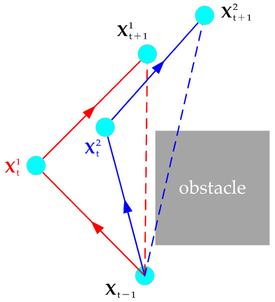 The valid move length is defined as the sum of the Euclidean distance between and and the Euclidean distance between and minus the Euclidean distance between and . As shown in Figure 4, we can substitute , , and , , into Equation (13) to compare the path smoothness of the red path and the blue path, respectively. The smaller the calculation result of Equation (14), the smoother the path will be. When three path points are on a straight line, Equation (14) obtains the minimum value 0, and the path is the smoothest.