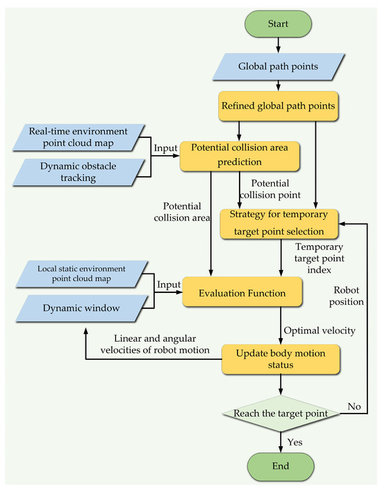 In this section, the method for predicting potential collision areas is first illustrated. Then, the strategy for selecting temporary target points is introduced. Finally, the related evaluation function is constructed, which takes the effect of the velocity of dynamic obstacles into consideration. The overall framework of the improved DWA is shown in Figure 6.