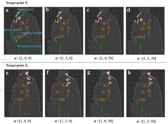 The initial position of the robot in the world coordinate system was set to . Two target destinations in the world coordinate system were set in our experiment: and . In the experiment for evaluating terrain complexity, the weight factors of the roughness and undulation were set as β1 = β2 = 1. Four sets of weight parameters of the fitness function were applied to each target point, which were set to [1, 0, 0], [1, 5, 0], [1, 0, 50], and [1, 5, 50], respectively.
