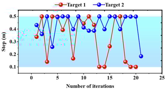 Obviously, a larger effective step ratio means that the global path is closer to a straight line, which also represents a smoother global path. The step variation is shown in Figure 13. The step was adaptively adjusted between 0.1 and 0.5 m. The effective step ratio was calculated by using the average of steps in all iterations. The fixed step was set to five sets of values from 0.1 to 0.5 m. The effective step ratio is shown in Table 4. As can be seen from the table, our method obtains a higher effective step ratio, with a maximum improvement of 9/0.67 ≈ 13.4 times and an average improvement of (9/0.67 + 3.2/0.43)/2 ≈ 10.4 times. Furthermore, our method requires fewer iterations, resulting in a maximum improvement of 121/21 ≈ 5.8 times and an average improvement of (121/21 + 103/20)/2 ≈ 5.5 times. The experimental results illustrate that our method can improve both path planning efficiency and path smoothness.