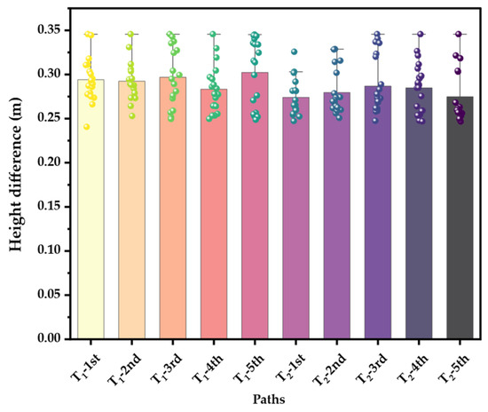 The height of global path points above the ground was used as the metric to evaluate the path reliability. The ground height is represented by the average height of the terrain point cloud in the neighborhood. The global path planning was repeated five times to check the height difference. It can be seen from Figure 14 that the height of the robot’s torso from the ground was maintained within the range m, comparable to the maximum height of the attractive point and the minimum height of the repulsive point. Thus, the validity and rationality of the method for constraining the height of the torso using the terrain point potential field were verified.