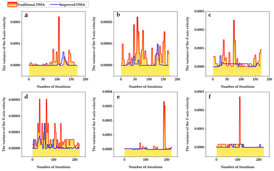 The velocity planning results of the improved DWA and traditional DWA algorithms. Only the linear velocity of the body in the X and Y directions, along with the angular velocity around the Z-axis, is compared. (a–c) Obstacle 1. (d–f) Obstacle 2.
