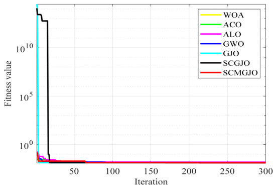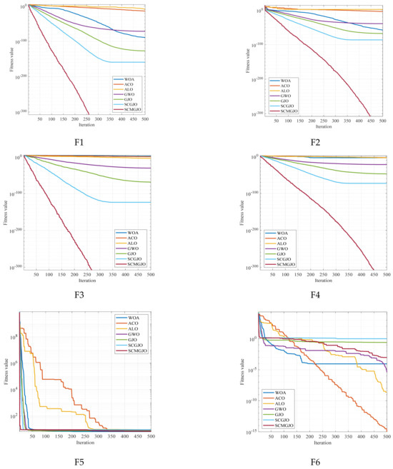 In order to fully verify the effectiveness of the SCMGJO algorithm designed in this study in solving optimization problems, a series of experiments were conducted in this study. All algorithms were run on the experimental platform of Windows 11, 16GB memory, and a 64-bit system, and experiments were conducted using Matlab2022a. This paper selects the whale optimization algorithm (WOA) [45], ant colony optimization algorithm (ACO) [46], ant lion optimization algorithm (ALO) [47], gray wolf optimization algorithm (GWO) [48], golden jackal optimization algorithm (GJO), and the sine–cosine golden jackal optimization algorithm (SCGJO) [39] for comparison.