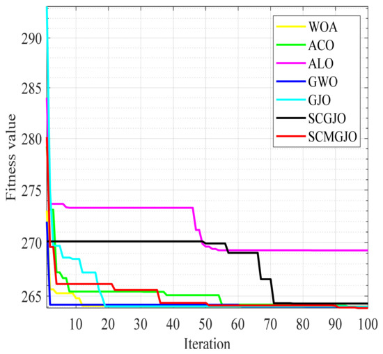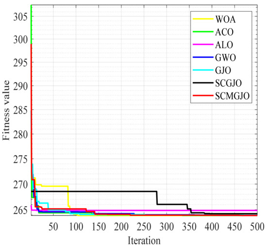 Figure 4 and Figure 5 show the 100-iteration and 300-iteration diagrams of the comparison of different algorithms in solving the tension/compression spring design problem, respectively. Table 7 and Table 8 show the objective function values of different algorithms in solving the tension/compression spring design problem under 100 iterations and 300 iterations, respectively. From Table 6 and Table 7, it can be seen that the objective function value obtained by the SCMGJO is the smallest, which is better than the objective function values of the WOA, ACO, ALO, GWO, and GJO, indicating that the improved SCMGJO can minimize the manufacturing cost of this project compared to other algorithms, overcome multiple interference factors, and demonstrate the superior ability of the SCMGJO in solving the tension/compression spring design problem in this paper.