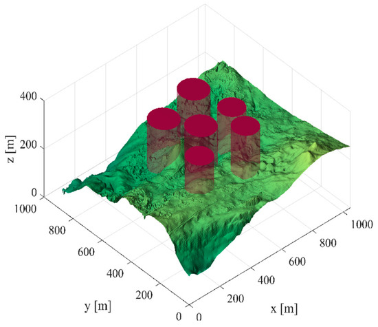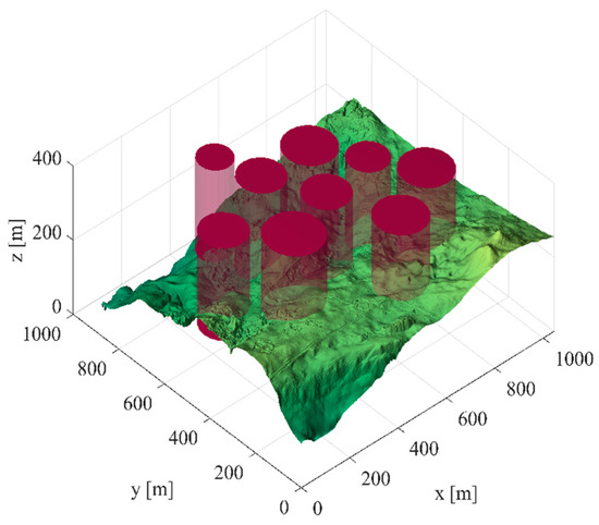Scene 2: There are nine threat sources in this scene, and Table 12 shows the threat source information. The starting position of the unmanned vehicle is (200, 100, 150), and the ending position is (800, 800, 150). Figure 13 shows the three-dimensional scene after setting the parameters.