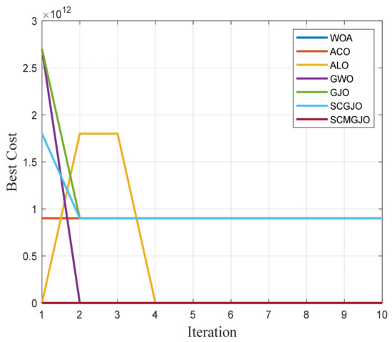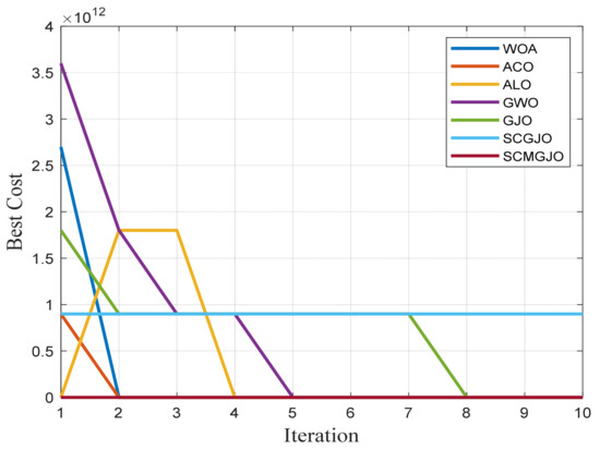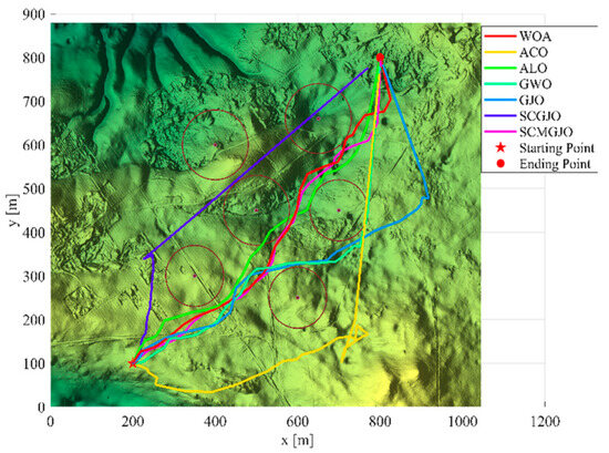 In Scene 1, the top views and three-dimensional simulations of the unmanned aerial vehicle path planning for each algorithm are shown in Figure 10 and Figure 11, respectively. From these figures, it can be seen that SCMGJO outperforms other algorithms in both top views and three-dimensional coordinates. The GJO does not avoid the last threat source and flies straight through it, while SCMGJO has a significant performance improvement compared to the GJO. The WOA’s planned path can be clearly seen in both the top view and three-dimensional view, which is inferior to SCMGJO. Although the GWO does not fly through the threat source like the GJO, it has a detour behavior. The ALO and the ACO are similar to the SCMGJO in the top view, but in the three-dimensional coordinates, it can be clearly seen that the ALO and the ACO have multiple fluctuations in the vertical height, which affects the overall cost. Figure 12 shows the iterative cost curve of each algorithm.