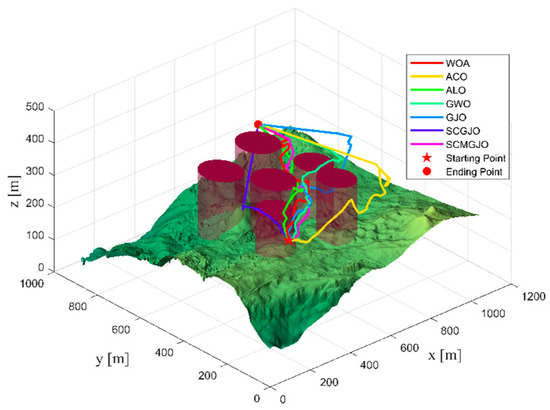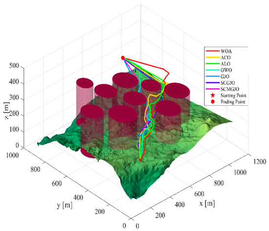 To verify the effectiveness of the SCMGJO proposed in this paper in the unmanned aerial vehicle path planning problem, this experiment sets up two different scenarios for simulation experiments. The flight space size is 1000 m × 1000 m × 400 m, the number of selected populations is 100, and the number of iterations is 10. The whale optimization algorithm (WOA), ant colony optimization algorithm (ACO), ant lion optimization algorithm (ALO), gray wolf optimization algorithm (GWO), golden jaguar optimization algorithm (GJO), and the sine–cosine and Cauchy mutation golden jackal optimization algorithm (SCMGJO) are selected for comparison. The unmanned aerial vehicle needs to fly from the starting point to the end point and bypass the threat source. The cost function is used to measure the performance of the algorithm in the unmanned aerial vehicle path planning. The lower the cost, the better the performance. In this experiment, two different scenarios are used in the simulation to test the performance of each algorithm in the unmanned aerial vehicle path planning.