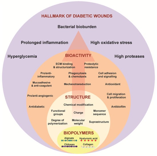 Chronic wounds are non-healing wounds that are characterized by prolonged inflammation, high proteases, and high reactive oxygen species (ROS) produced locally in the tissue. Diabetic ulcers are one such chronic wound that develops due to systemic hyperglycemia and neuropathy in diabetic patients [14,15]. Bioactives can have wide applications in treating chronic inflammatory conditions, especially diabetic wounds, due to their therapeutic bioactivity [16]. This article is a comprehensive review of the link between the inherent structural characteristics of natural bioactive biopolymers that are frequently used and their effectiveness in treating chronic wounds. It explains the structure–function relationship with a particular focus on the design tactics for wound healing materials based on biopolymers and not on bioactive secondary metabolites.