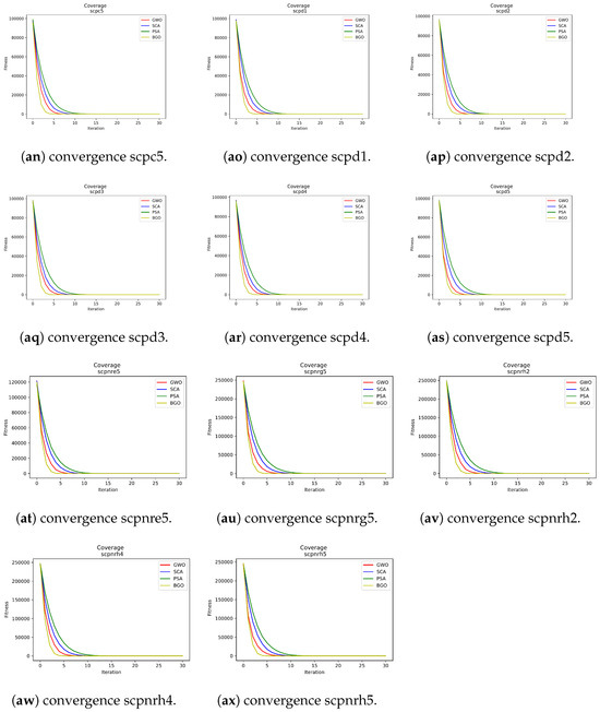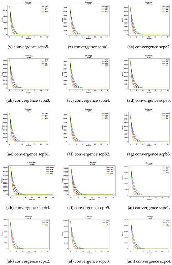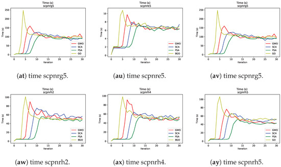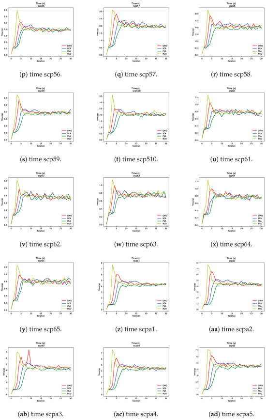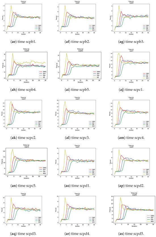 - Sine–cosine algorithm: This algorithm showed a moderate convergence speed compared to the two aforementioned metaheuristics. Although it may not be the fastest choice, it remains an effective metaheuristic for addressing SCP instances.