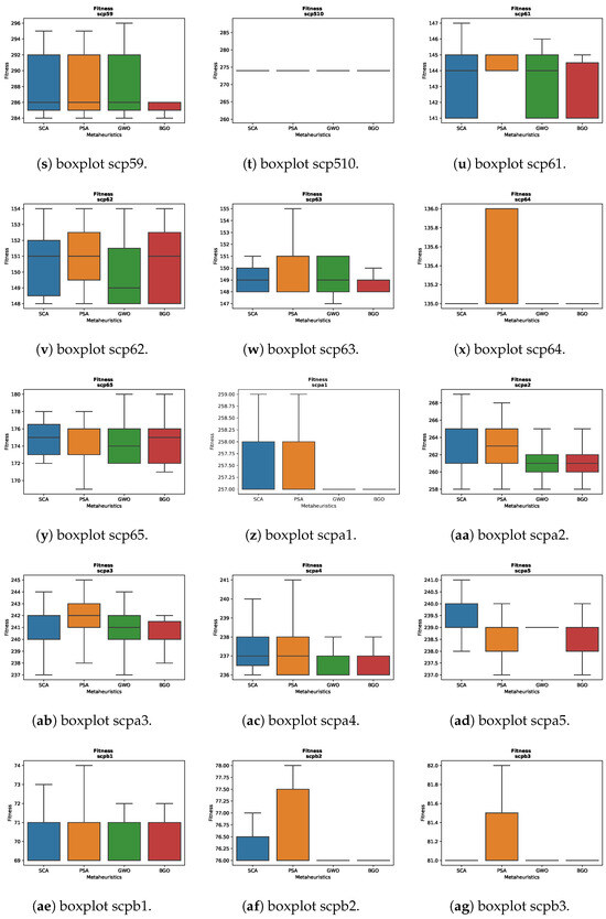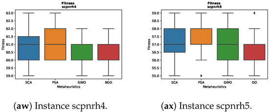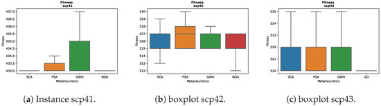 For the instance scp43 in Figure 3c, significant differences in the results are observed among the various metaheuristics. The BGO displays a boxplot that is close to a line, indicating rapid convergence towards low fitness values. On the other hand, the other metaheuristics maintain more uniform boxplots, suggesting more consistent performance in this particular instance.