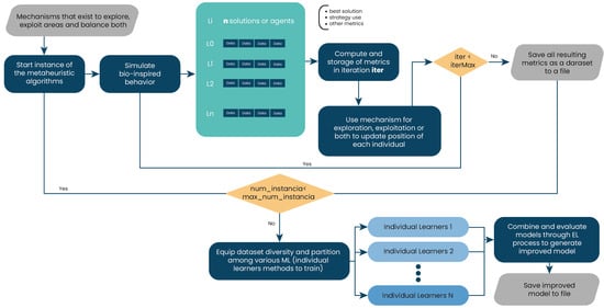 14]. However, in many cases, the procedure guiding nature-inspired algorithms operates individually; that is, it is a single technique that enhances the optimization algorithm. Our work proposes a new balance between exploration and exploitation using ensemble learning (EL). This strategy involves integrating a machine-learning technique with specific characteristics to achieve superior results. As surrogate optimization algorithms, we employ seven well-known bio-inspired techniques: particle swarm optimization, gray wolf optimizer, firefly algorithm, bat algorithm, whale optimization algorithm, crow search algorithm, and differential evolution. We chose these mechanisms because they exhibit a linear characteristic of avoiding solutions trapped in local optima while balancing the exploration and exploitation phases.