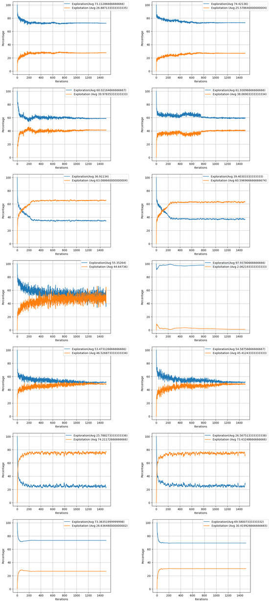 Exploration and exploitation percentages of PSO, PSOEL, GWO, GWOEL, FA, FAEL, BA, BAEL, WOA, WOAEL, CSA, CSAEL, DE, and DEEL involved in Exp6.