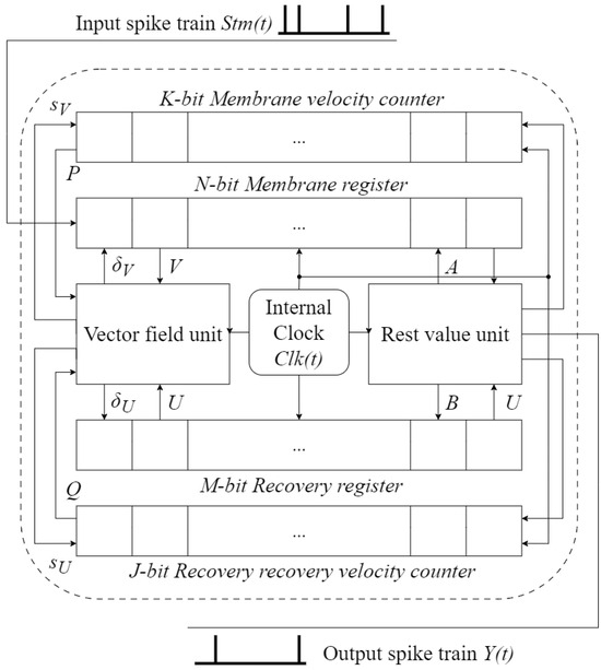 - The recovery register is an M-bit bidirectional shift register with an internal state U in the range of , representing the recovery variable of the neuron model.
