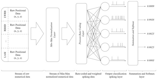 The architecture of the SNN, encompassing its layers and the procedure of converting data into spikes, is elucidated. The proposed SNN consists of three main layers, as illustrated in Figure 3: an input layer, where data are fed into the network; a rate-coding layer, where data are transformed into a format suitable for neurons (i.e., spikes); and a classification layer composed of ACANs with uniform registers of size R, which also functions as the output layer. This layer conducts a comparison between the real outputs and the predicted outputs of the neurons. During both training and testing, performance is evaluated by using a summation and softmax layer, which is implemented as described in [35,36]. The data are displayed as time intervals of positional x, y, and z data for thirty-eight (38) distinct markers positioned on the individuals’ bodies. This particular dataset is unsuitable for utilization with SNNs, hence necessitating its conversion into spike-based representations.