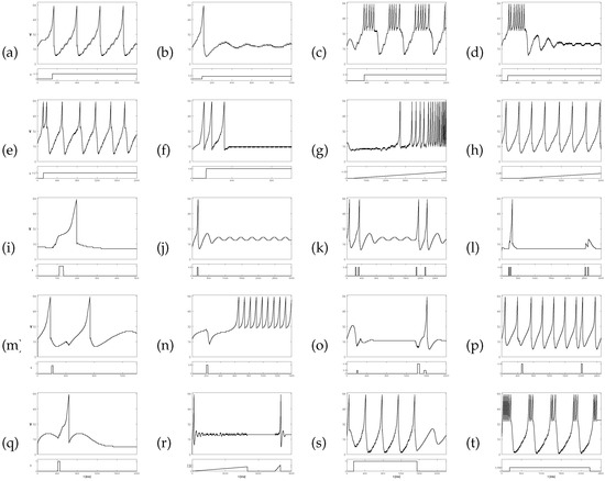 The various spiking patterns reproduced by using our VHDL-implemented ACAN model in the ModelSim environment. The patterns are organized from left to right and from top to bottom: (a) tonic spiking, (b) phasic spiking, (c) tonic bursting, (d) phasic bursting, (e) mixed-mode spiking, (f) spike frequency adaptation, (g) class 1 excitation, (h) class 2 excitation, (i) spike latency, (j) sub-threshold oscillation, (k) resonator, (l) integrator, (m) rebound spike, (n) rebound burst, (o) threshold variability, (p) bistability, (q) depolarizing after-potential, (r) accommodation, (s) inhibition-induced spiking, and (t) inhibition-induced bursting.