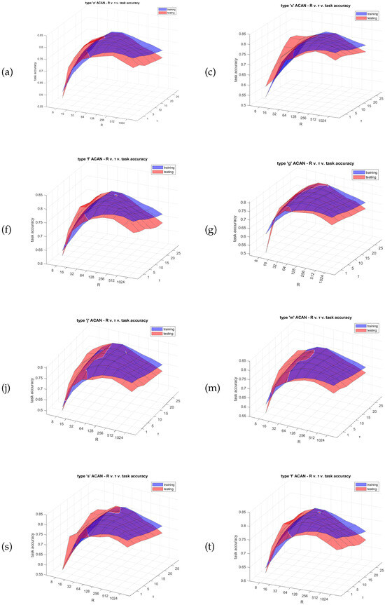 Parametric analysis of different ACAN neuron types for the MNIST hand-written digit dataset. The analysis was carried out by adjusting the register range (R), time constant (), and ACAN neuron configuration parameters. Left to right, top to bottom: (a,c,f,g,j,m,s,t) ACAN model parameters were used as presented in Table 2. The figures illustrate the influence of varying the size of the ACAN’s register (R) and the time constant () of on the training accuracy (in blue) and the test accuracy (in red).