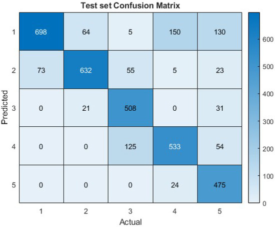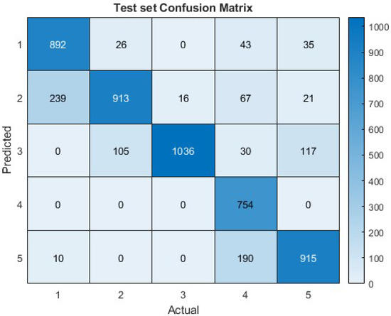 Another approach to enhancing the network’s performance was attempted by considering input features as distinct and autonomous, similar to how the image’s pixels were handled in the MNIST hand-written digit classification experiment. With the identical conditions as the MNIST experiment, but with 10 time step units per input instead of 30, the input size increased to an 11,400 × 10 matrix, which is a thousand times larger than that in the previous experiment. This has a substantial impact on execution times (about ∼2800 seconds each epoch). By using an training/test split, the data setup achieved a test accuracy of , indicating a 4.5% improvement, as shown in Figure 7.