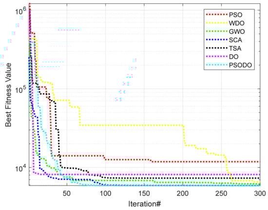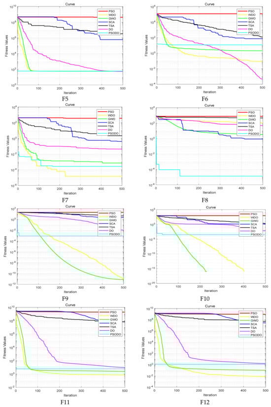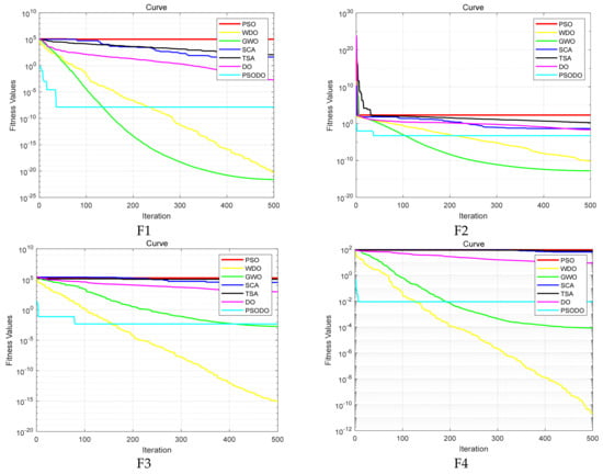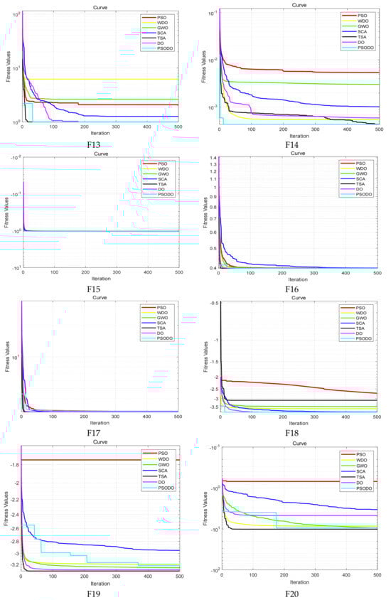 In order to compare the convergence of each algorithm on different functions more intuitively, this paper draws the convergence curves of the PSODO algorithm and the other six algorithms. Comparisons of the convergence curves of seven algorithms are shown in Figure 2, with the horizontal axis representing iteration and the vertical axis representing fitness values. As can be seen from Figure 2, the PSODO algorithm has the fastest convergence speed and the highest convergence accuracy on functions F5, F8, F13–F18 and F21 and can find nearly the optimal value at the beginning, especially functions F8 and F14. It converges to the optimal value in the form of an approximate straight line. For function F7, the convergence speed of the PSODO algorithm is slightly slower than that of GWO, ranking second. For functions F1–F4 and F9–F12, the convergence speed of the PSODO algorithm is slightly slower than that of GWO and WDO, ranking third. For functions F6, F19, F20 and F22, the convergence speed of the PSODO algorithm is relatively average, but the optimal value can be found in the end. Thus, it is proved that the performance of the PSODO algorithm is relatively good and the multi-strategy improvement–decreasing speed strategy is feasible and effective for improving the convergence speed and accuracy of the algorithm.