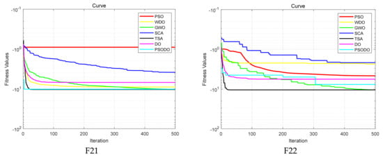 It can be seen from Table 2 that in 30 dimensions, PSODO obtains the optimal values on functions F2, F3, F4 and F7–F10, especially on F4, F7 and F9, while all algorithms do not converge to the optimal values on functions F5 and F6. The optimal value is also found on the multimodal function F8–F10. On the fixed dimension functions F13–F22, PSODO finds the optimal value. It can be seen from Table 3 that PSODO can still achieve optimal values on functions F2, F3, F4, F7–F10 and F13–F22 when the dimension is 60. To sum up, PSODO has good optimization performance in unimodal, multi-modal and fixed-dimensional functions and low-dimensional and high-latitude problems. In view of the poor performance of some functions, we introduce speed decline strategies to improve the optimization performance of the algorithm, including but not limited to a linear decline strategy and exponential decline strategy.