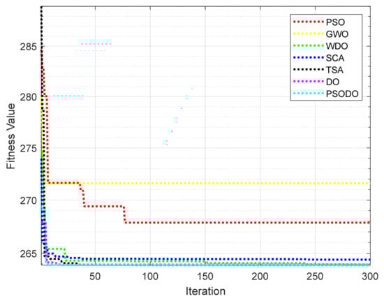 Based on the improved algorithm PSODO, the tension/compression spring problem is optimized and the values of related parameters are obtained. The optimized results are compared with algorithms in other articles. Detailed information is shown in Table 8. The convergence curve of the compression spring design problem is shown in Figure 5.