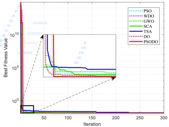 The PSODO algorithm is implemented based on MATLAB language. The experimental environment is configured as the Windows 11 operating system, CPU AMD Ryzen 97945HX, and the MatlabR2022a experimental platform is used for simulation. In order to validate the performance advantages of the PSODO algorithm, the benchmark functions are used to simulate the standard particle swarm optimization (PSO) [], dandelion optimization (DO) [], gray wolf optimization (GWO) [], sine–cosine optimization (SCA) [], wind-driven optimization (WDO) [] and tree species optimization (TSA) []. The test functions are all selected from the global test function library of CEC 2005, and their function forms, search ranges and optimal solutions are shown in Table 1.