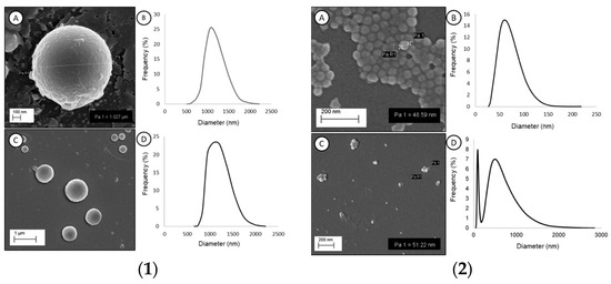 (1) Representative SEM images (A and C) and size distribution of polystyrene microplastics (B and D) in FMQ (A and B) and FSSW (C and D). Data from DLS are presented as total mean diameter. (2) Representative SEM images (A and C), size distribution (B and D), and size distribution of PS-NH2 NPs in FMQ (A and B) and FSSW (C and D). Data from DLS are expressed as total mean diameter.