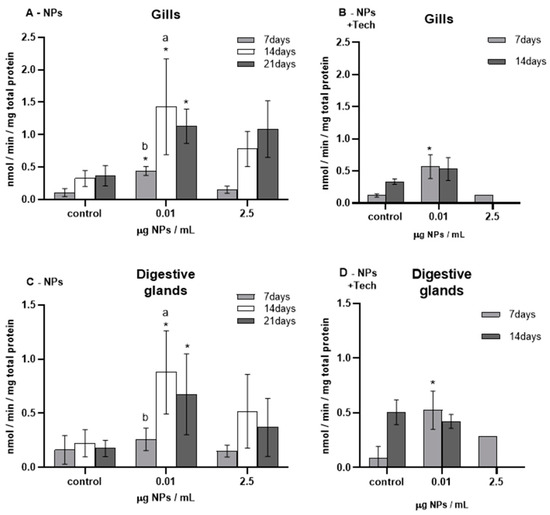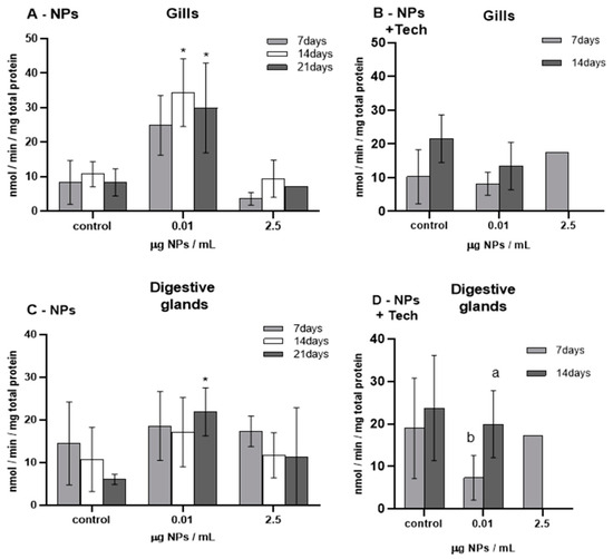 Regarding the exposure to NPs, a significant increase in LPO was registered in the gills of mussels exposed to 0.01 µg NPs/mL for all exposure periods, while in the digestive glands, this increase was only significant after 21 days of exposure compared to controls.