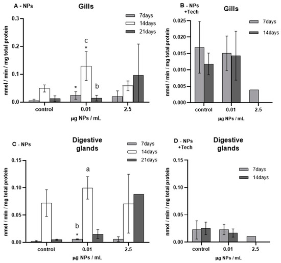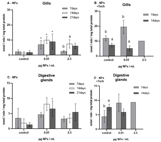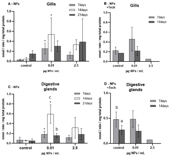 Before the beginning of the bioassays (T0), CAT activity was measured and presented values of 0.10 ± 0.04 and 0.21 ± 0.11 nmol/min/mg total protein for the gills and digestive glands of mussels exposed to NPs, respectively, and 0.06 ± 0.04 and 0.35 ± 0.30 nmol/min/mg total protein for the gills and digestive glands of mussels exposed to NPs with the aggregation method. When these values were compared with the respective controls, no significant differences were found except for controls in the gills after 14 (p = 0.009) and 21 days (p = 0.009) of exposure to NPs.