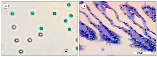 Bioindicators are defined as species capable of biomonitoring the quality status of an environment in terms of evaluating contaminants’ content, bioavailability, and toxicity [55]. For instance, mussels are one of the chief groups of organisms used for the assessment of many pollutants and toxic substances in the marine environment, including MNPs [56,57,58]. Due to their non-selective filter-feeding strategy, mussels internalize large volumes of water, which are frequently in contact with those pollutant particles [1,32]. Furthermore, on the food web, they are generally primary consumers, and therefore, they continuously transfer matter throughout higher trophic levels, which may lead to biomagnification [59]. Mytilus galloprovincialis, commonly known as Mediterranean mussel, is a commercially relevant bivalve mollusk that inhabits the intertidal and subtidal areas of rocky shores. Despite being native to the Mediterranean and Eastern Atlantic, nowadays, this mussel species has a wide range of distribution and can be found in South America, South Africa, Japan, and Australia [60,61]. Its wide distribution, feeding behavior, and commercial value make these organisms good biological models for MNP hazard and toxicological assessments [62]. Indeed, various authors have used M. galloprovincialis for MNP studies and revealed that these particles could induce a stress response [32,56].