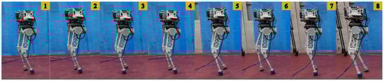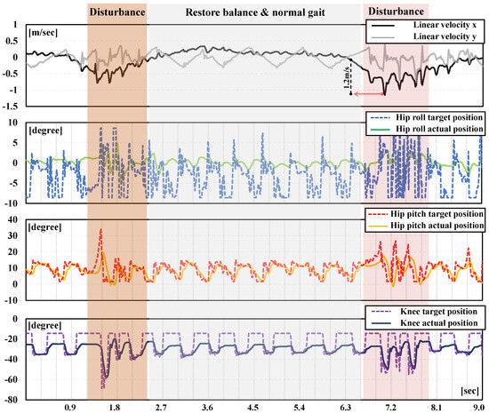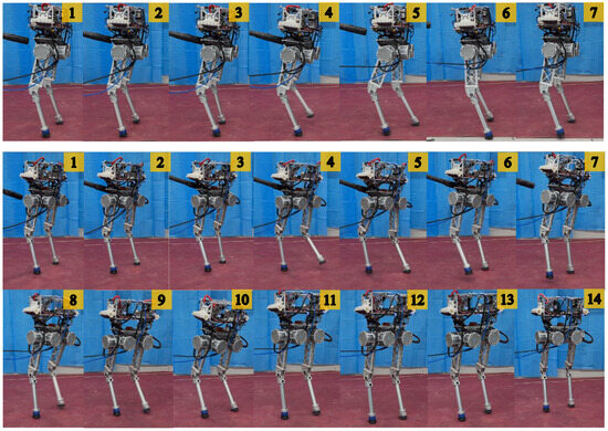 As shown in Figure 8, the normal gait of the stimulus frequency policy can achieve primary balance, which verifies the effectiveness of the sim-to-real transfer of our framework on the BITeno hardware platform even using only the static signal. Furthermore, it can be seen from the snapshots in Figure 8 that the robot only made one step as an emergency action under a usual disturbance, resulting in an insufficient dynamic performance of the robot and it falling down. In addition, the support leg should act more agile to maintain balance at this time, but the target positions of the joints did not work with suitable frequencies. Actually, without learning dynamic skills, the bipedal locomotion in this experiment achieved the expected performance and satisfied the upper limit of the capability of the normal gait.