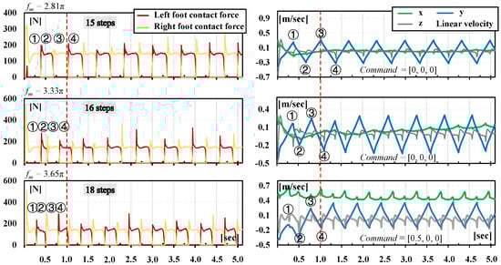 In detail, BITeno can implement stable bipedal locomotion using a normal gait on flat ground. Furthermore, different constant frequencies were used as inputs for the actor policy, as shown in Figure 6. Despite no disturbances being applied to the robot, it still generated varying step counts within a fixed period of time. Moreover, the foot contact force and the torso velocity also maintained good coupling over time, which is also a necessary basis for stable gaits. Therefore, all of these results demonstrate the adaptability of the current control framework.
