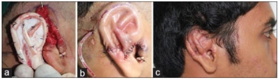 Staged reconstruction of auricular defect using costal cartilage. (a): Costal cartilage framework. (b): Cartilage framework tunneled subcutaneously and inset. Skin is contoured over the framework. (c): Postoperative result after first stage. Reprinted under Creative Commons License from ref. [74]. 2015, Creative Commons.