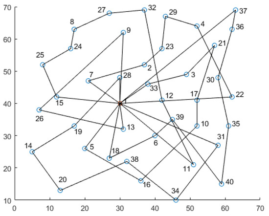 To accurately analyze the effectiveness of DGWO-F2OPT in solving MO-CCVRP-OT, a CVRP standard calculation example was used and modified. Node information for the experiment example is shown in Table 4. Node 1 represents the depot, and nodes 2–40 represent disaster-affected points.