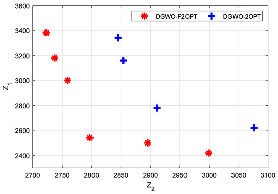 - The non-dominated solutions of DGWO-F2OPT are of better quality than those of DGWO-2OPT. DGWO-F2OPT can obtain solutions with lower numerical values for both Z1 and Z2, while DGWO-2OPT can only obtain solutions with lower numerical values for Z1, resulting in the uneven distribution of solutions at the Pareto boundary. It can be concluded that the DGWO-F2OPT algorithm has a better search capability;