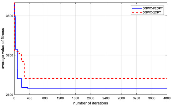 - The average value of the twelve finesses value of six solutions of DGWO-F2OPT is 2827.5, while that of the eight finesses value of four solutions of DGWO-2OPT is 2948.25. The average value of the finesses of DGWO-F2OPT is smaller than that of DGWO-2OPT. From the perspective of the average value of finesses of both algorithms, DGWO-F2OPT has a better solving ability.