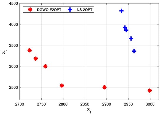 - For the non-dominated solutions of DGWO-F2OPT, the utopia point in the bi-objective plane is (2723, 2420), and the utopia optimum is (2797, 2540). The utopia point and the utopia optimum for NS-2OPT are (2934, 3360) and (2963, 3360), respectively. The utopia point and the utopia optimum DGWO-F2OPT achieves have smaller values than those DGWO-F2OPT obtains. From the perspective of the utopia point and the utopia optimum of both algorithms, DGWO-F2OPT obtains higher-quality solutions than DGWO-F2OPT;