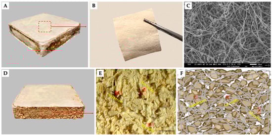 Illustrates the primary structural components of MBCs, showcasing both their surface and cross-section ((A) depicts the MBCs sample; (B) shows the surface of MBCs removed from the samples; (C) offers scanning electron microscopic images of the MBCs surface; (D,E) display the cross-section area of MBCs; (F) presents a model of the cross-section area of MBCs).