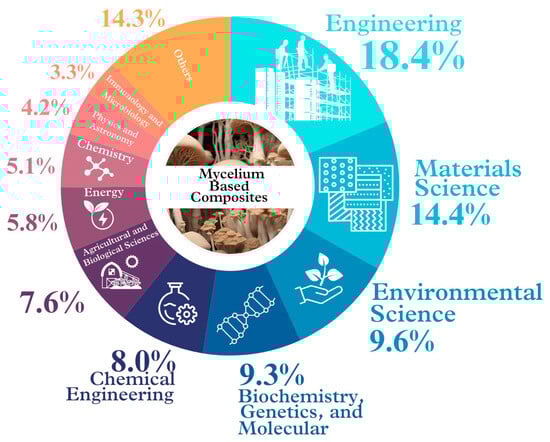 A current preliminary search in [32] (https://www.scopus.com/search/form.uri?display=basic#basic; accessed on 2 March 2024) conducted using the keywords “mycelium & based & composites” over the past five years (2020–2024) revealed over 180 studies on MBCs, predominantly within the fields of engineering, materials science, and environmental science. Moreover, there are studies across more than ten related fields, indicating a growing interest in this material (Figure 2). In the future, the seamless cooperation and integration across these different fields like microbiology, chemistry, physics, materials science, engineering, environmental science, architecture, and business management, will be crucial for advancing MBCs production. For example, in microbiology, scientists investigate different fungal species to select and optimize the growing conditions for mycelium [2,33,34,35,36,37]. Chemistry helps understand the chemical composition and mechanisms in mycelium growth [19,30,38,39,40]. Physics examines MBCs’ mechanical properties, while materials science focuses on improving them [3,41,42,43]. Engineering plans and controls production processes for efficiency [44] and environmental science assesses their impact and sustainability [45]. Architecture explores and designs MBCs’ applications [46,47,48,49], and business management develops models and strategies [50]. Ultimately, multidisciplinary collaboration is paramount for driving innovation in MBCs development [49,51].