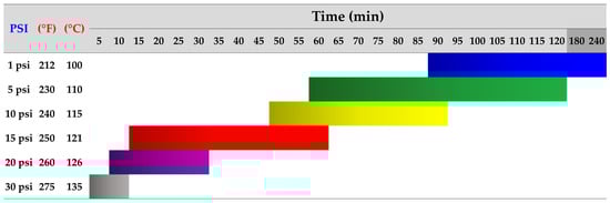 Recommendations for utilizing high-heat sterilization methods to prepare substrates for mycelium cultivation, adapted from Mycobio [133] and Salish Sea Mushrooms [135], supplemented by additional references, including Sydor et al. [23], Bellettini et al. [129], and Freak of Natural [136]. Sterilization efficiency is indicated by color: blue for 1 PSI at 100 °C for 90–240 min, green for 5 PSI at 110 °C for 60–120 min, yellow for 10 PSI at 115 °C for 50–90 min, red for 15 PSI at 121 °C for 15–60 min, purple for 20 PSI at 126 °C for 10–30 min, and gray for 30 PSI at 135 °C for 5–10 min.