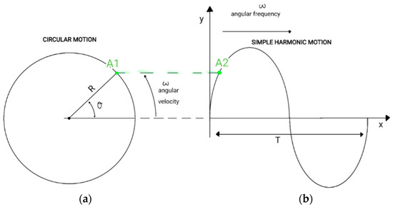 The governing pitching of the airfoil equation must be defined as a time-dependent sinusoidal equation that guarantees the AoA oscillation. For enhanced comprehension, the following scheme represents the transition between the angular velocity , defining circular motion, and the angular frequency , characterizing the simple harmonic motion (SHM) (see Figure 2).