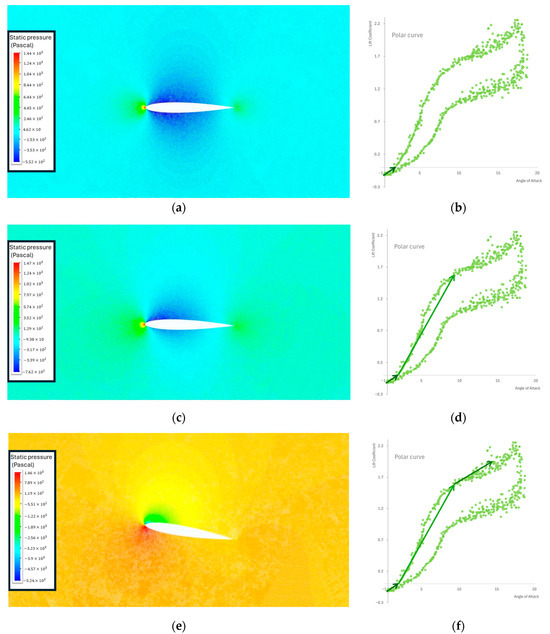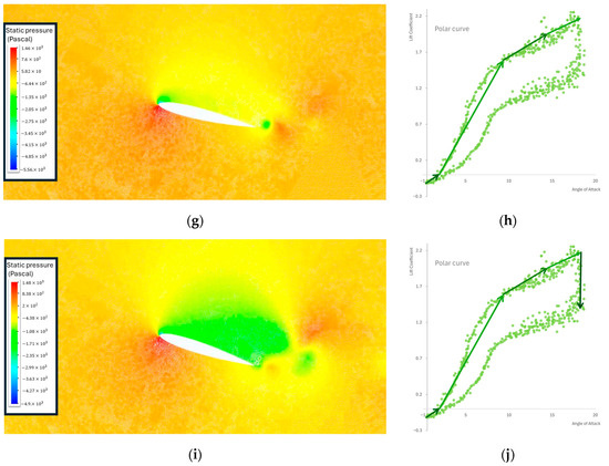 Firstly, the UDF was tested on a NACA 0012 profile of larger chord length () at . The results are presented in Figure 3 and serve as an example of the effect of dynamic stall on the pressure contour of the airfoil, juxtaposed with the theoretical polar curve depicting the lift coefficient against the AoA. The pressure contour on the lower contour of the airfoil is slightly bigger than the one on the upper contour, resulting in lift generation (Figure 3c,d). The dynamic-stall vortex is forming at the leading edge of the airfoil. The swift rotation of the airfoil to a AoA does not immediately induce a pressure change on the upper surface corresponding to the new AoA. This delay is attributed to the time lag between the airfoil’s motion and the subsequent pressure response (Figure 3e,f). The dynamic-stall vortex advanced on the upper contour of the airfoil from the leading edge to the trailing edge. The airfoil momentarily reacts to a lower AoA than the geometric AoA at its current state. The delayed response to the geometrical AoA also results in a postponement of the boundary layer separation. The vortex is initiated near the leading edge of the airfoil and progresses toward the trailing edge along the upper contour of the airfoil. During this stage, a substantial additional lift is generated. Once the dynamic stall vortex surpasses the trailing edge, there is a notable reduction in lift (Figure 3g,h). Upon reaching the ultimate stage, leading to complete flow separation (deep stall state), the flow reattachment phase persists as the AoA decreases. The process concludes when the flow is fully reattached to the contour of the airfoil (Figure 3i,j).