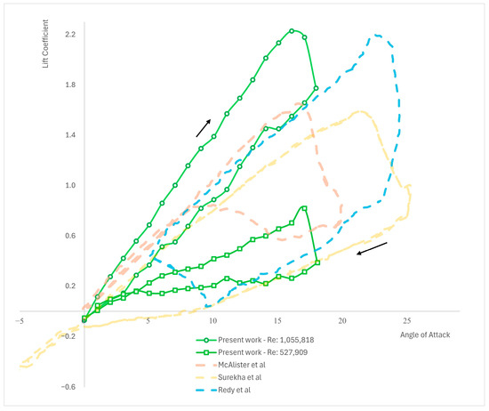 Analyzing Figure 6, it can be observed that the lower the Reynolds number, the lower the lift slope is. At , it can be observed that the lift coefficients are close to zero for the return line. The highest lift slope is obtained at . Overall, if the lift coefficients from all the three cases are analyzed, it can be observed that lift coefficients decrease when the chord length is decreased. By incorporating DES into the numerical simulations of micro airfoils, this study enhances the fidelity and accuracy of the results obtained. Specifically, DES enables the capture of both near-wall turbulence and large-scale unsteady flow structures, providing a comprehensive representation of the complex aerodynamic interactions during dynamic stall.