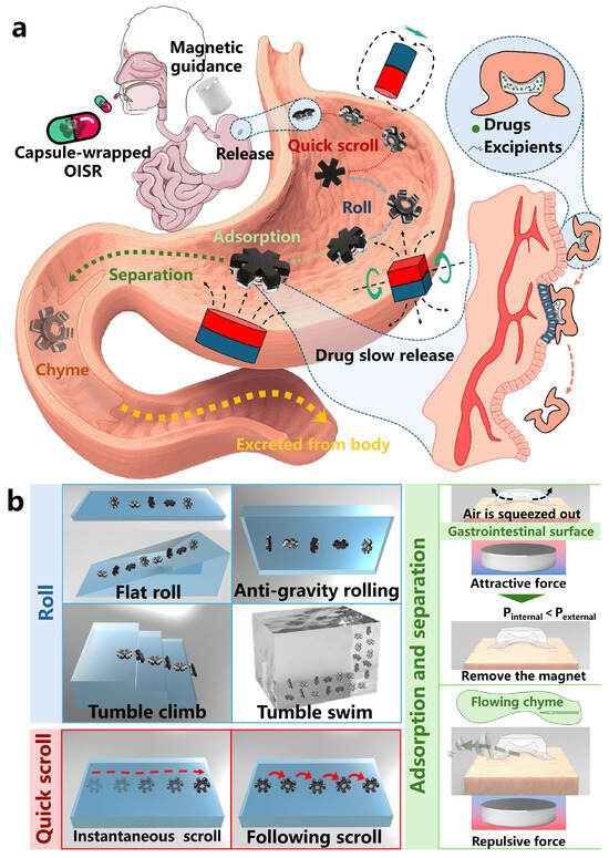 Realization of slow drug release and multimodal motion of OISR. (a) The OISR’s suction cup stores the drug internally and moves to the targeted drug delivery site through quick scrolling and rolling motions. The suction cup stably adheres to the drug delivery site through the adhesive force generated by the magnetic gradient, thus achieving slow drug release in the gastric tissue. After drug delivery is completed, the OISR detaches from the gastric tissue and passes into the small intestine along with the process of gastric digestion. (b) The OISR exhibits rolling, quick scrolling, adsorption, and separation motions.