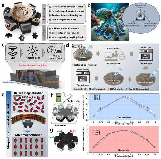 where represents the magnetic susceptibility tensor of the material. As shown in Figure 2e, the OISR’s plane is attached to a 3D-printed fixture and placed in a capacitive pulse power supply (J1801N, JinL, Nanjing, China) for magnetization under a pulse magnetic field of approximately 1.8 T. The magnetization direction should align with the magnetization direction of the gradient-force-enhancing unit in the sucker. After the magnetization process is completed, the high coercivity of the NdFeB particles results in the OISR exhibiting a stable magnetic moment. Using a Tesla meter (F-30, CH-Magnetoelectricity Technology, China), we measured the distribution of the surface magnetic flux density of the OISR at a height of 0.5 mm, which is the closest distance to the OISR surface when the gradient-force-enhancing unit is not assembled. As shown in Figure 2f, the concave side has a magnetic pole labeled as “S” (magnetic induction line inflow) with a maximum magnetic flux of approximately 8 mT and a minimum magnetic flux of approximately 4 mT. As shown in Figure 2g, the plane side has a magnetic pole labeled as “N” (magnetic induction line outflow) with a maximum magnetic flux of approximately 17 mT and a minimum magnetic flux of approximately 8 mT. Additionally, the external magnetic fields of the six grappling hooks exhibit good distribution consistency. This uniform magnetic field distribution benefits the stable force exertion on the OISR.