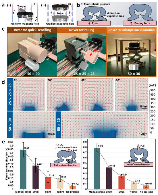 Different driver designs and magnetic field simulations as well as the peel resistance capability of the OISR. (a) (i): Effects of magnetic torque on the OISR. (ii): Effects of magnetic gradient force on the OISR. (b) Principle of adsorption force generation by the suction cup. (c) The permanent-magnet drivers for rolling, quick scrolling, and adsorption/separation. (d) The simulated magnetic field results for the three types of permanent-magnet drivers. (e) The peel resistance capability of the OISR in the normal and shear directions, comparing the cases of manual pressing, a permanent magnet at distances of 2 mm, 5 mm, and 10 mm from the suction cup base, and no preload.
