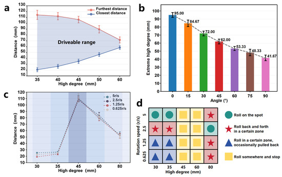 The motion analysis of quick scrolling and rolling of the OISR. (a) The drivable distance range for quick scrolling on a plane under different driving heights. (b) The maximum drivable height for flat rolling at different tilt angles. (c) The farthest drivable distance for flat rolling under different driving heights. (d) The four motion states of the OISR: rolling on the spot, rolling back and forth in a certain zone, rolling in a certain zone while occasionally pulling back, and rolling somewhere and stopping.