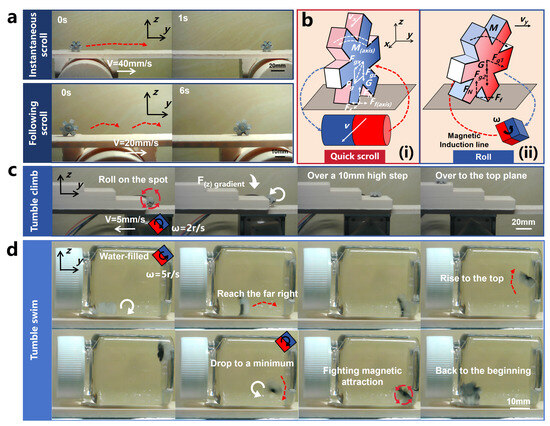 Instantaneous scrolling, following scrolling, tumble climbing, tumble swimming courses of motion, as well as force analyses of quick scrolling and rolling (The direction of the red dashed arrow represents the direction of OISR motion, and the length represents the approximate distance traveled by the OISR for one motion cycle unit. The direction of the red cyclic arrow represents the roll direction of the OISR’s in-place roll. The direction of the white linear arrow represents the direction of motion of the driver. The direction of the white rotary arrow represents the successful completion of a rolling movement of the OISR). (a) Two modes of quick scrolling: instantaneous scrolling and following scrolling. (b) (i): Force analysis during the process of quick scrolling. (ii): Force analysis during the process of rolling. (c) The process of tumble climbing to the top plane. (d) The upstream and return processes of tumble swimming.