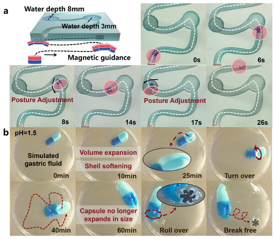 The guidance of the capsule inside the body and the release process of the OISR. (a) The capsule is guided through the simulated GI tract under an external magnetic field. (b) After the capsule dissolves in the simulated gastric fluid, the OISR is released through rolling.