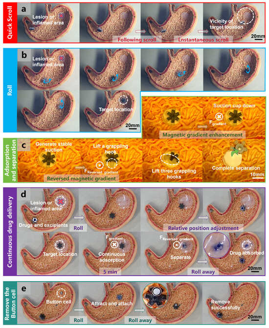 Quick scrolling, rolling, adsorption and separation, continuous drug delivery, and removing the button cell by the OISR in a simulated stomach environment. (a) The OISR quick scrolls inside the simulated stomach towards the vicinity of the target location. (b) The OISR rolls inside the simulated stomach to reach the target location. (c) The adsorption and separation of the OISR on the inner wall tissue of the simulated stomach. (d) The process of the OISR reaching the drug delivery target site and achieving continuous drug delivery. (e) The process of magnetizing, adhering to, and removing a swallowed button cell inside the stomach by the OISR.