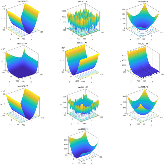 In this thesis, we rigorously tested and evaluated the performance of different algorithms based on the test function cec2021 [22], as shown in Table 2. Figure 3 shows the 2D shape of the cec2021 test function. In order to increase the fairness of the comparative experiments, we used Matlab2017 b to write the algorithm and simulate it. The algorithm was run on a Windows 10 64-bit system with 8 GB memory. The standard test functions were divided into four groups: unimodal test function (F1), basic function (F2–F4), mixed function (F5–F7), and combined function (F8–F10), as shown in Table 2. In the field of swarm intelligence optimization algorithms, this is often used to evaluate feasibility, efficiency, and robustness.